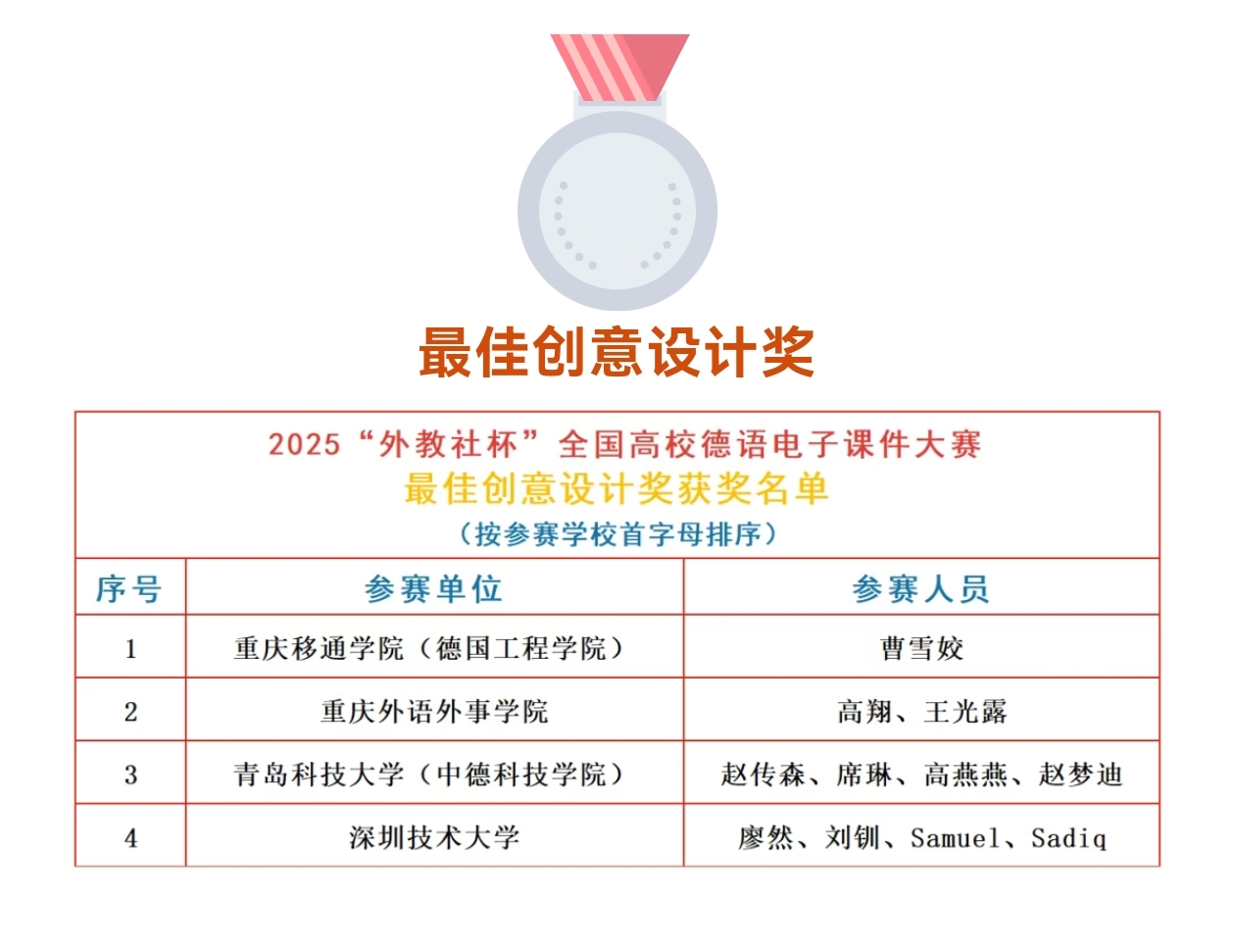 近日,2025“外教社杯”全国高校德语电子课件大赛圆满落幕,公司赵传森、席琳、高燕燕、赵梦迪教师团队凭借“产出导向法”教学设计理念与精湛的数字技术应用能力,从全国众多参赛高校中脱颖而出,一举斩获“全国一等奖”和“最佳创意设计奖”两项重磅荣誉。该团队在全国性权威赛事中实现历史性突破,同时获得两大奖项,不仅是对公司德语教学数字化改革成效与创新能力的高度认可,更是公司教师队伍过硬专业素养的生动彰显。