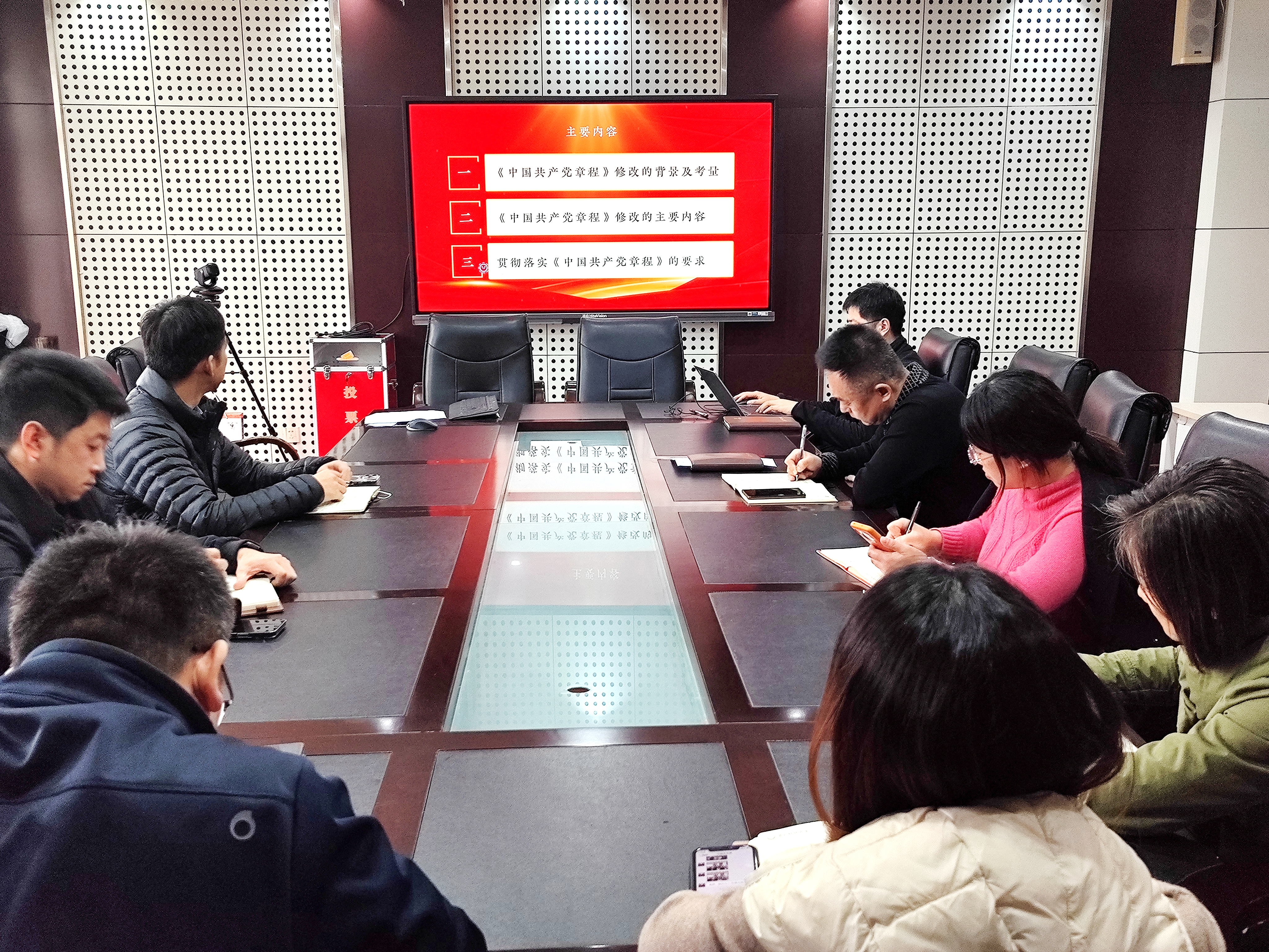 会上,全体成员共同观看中共中央党校(国家行政公司)党的建设教研部曹鹏飞教授讲授的学习贯彻《中国共产党章程》专题视频讲座。曹鹏飞从党章修改背景、修改内容和修改要求三个方面,对党的二十大审议的《中国共产党章程(修正案)》展开深入讲解,从党章修订的角度阐明了贯彻落实党的二十大精神具体要求。