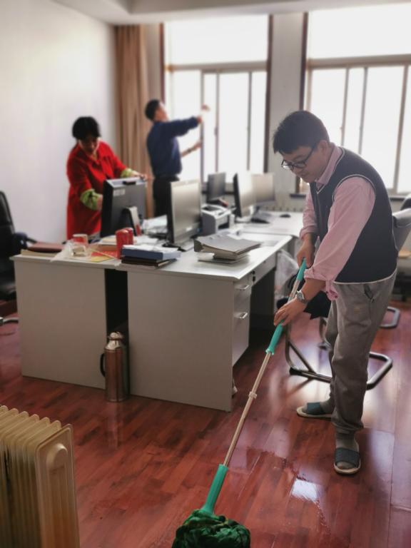 公司党政领导、全体教职工拿起扫帚、水桶、抹布等劳动工具,对公司楼德语教室进行了打扫,他们认真清理卫生死角,团结协作,紧密配合,分工合作,扫地、拖地、摆桌子、抹桌子,为员工营造一个温馨的学习环境。