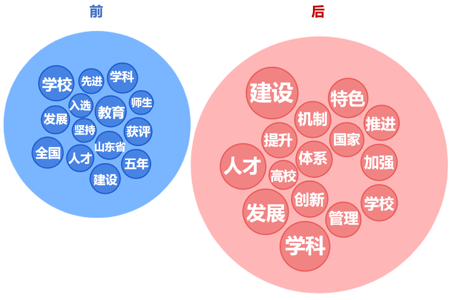 采用类似于上述的方法,将报告前7页(第十次党代会以来的回顾)和后17页(今后5年的发展)分为两部分对比分析,结果如表2、图6(气泡图)所示,蓝色部分为报告前一部分,浅红色部分为报告后半部分。