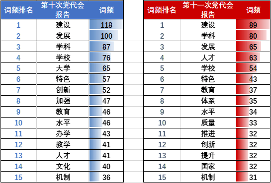 分别对第十次党代会报告和第十一次党代会报告进行分词,并进行词频统计,得到表3。