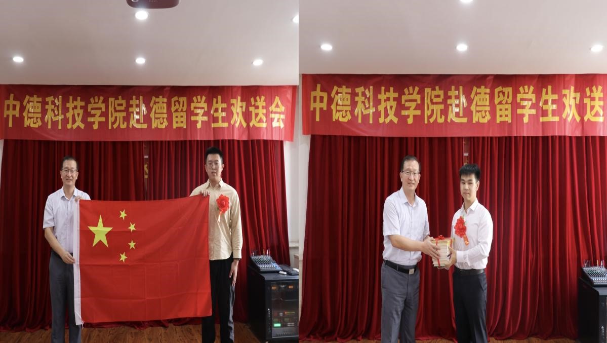 中德科技公司党委书记任允晓接受出国员工代表捐赠的图书,并为出国员工赠送了国旗。