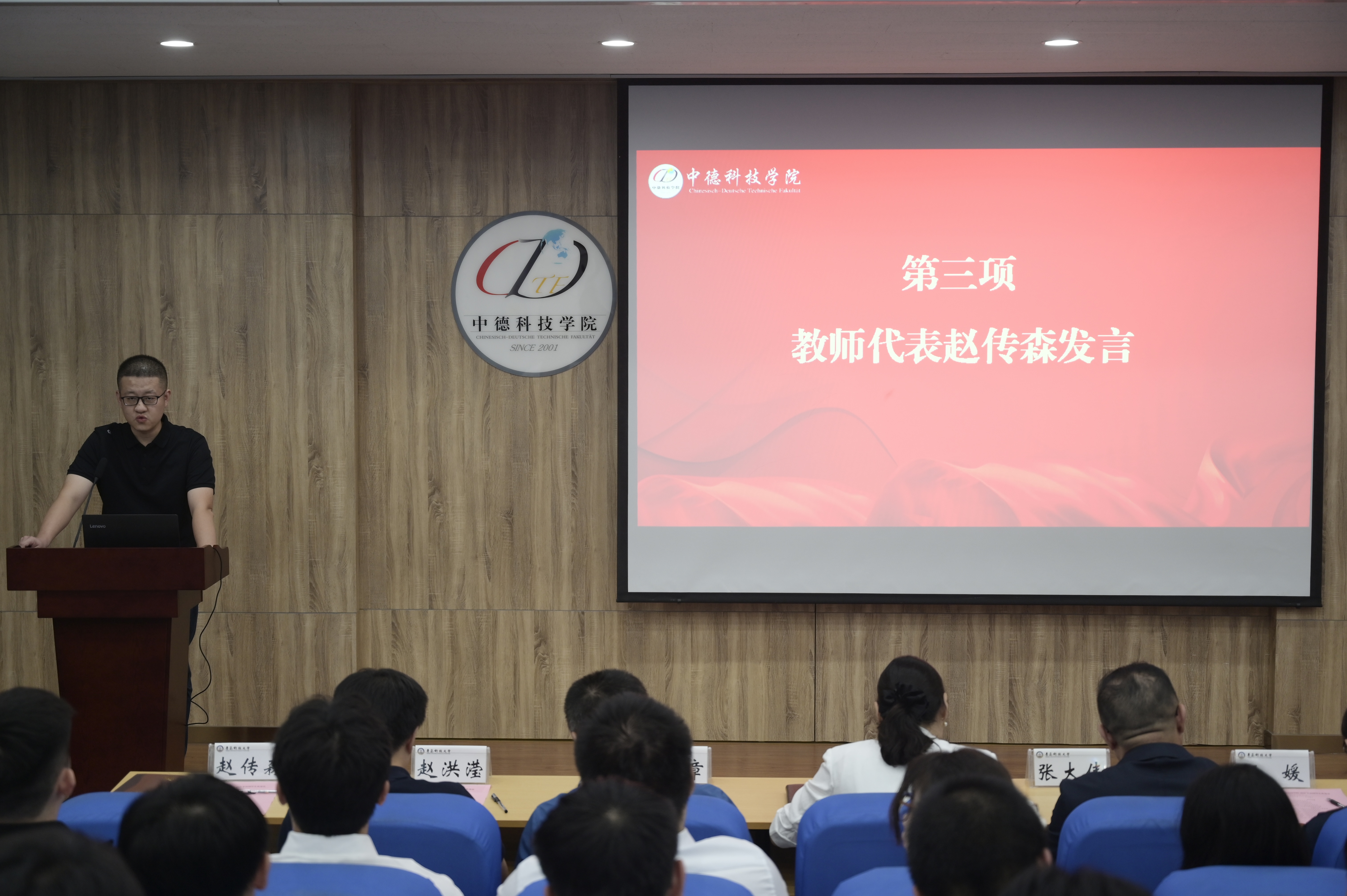 德语中心主任赵传森作为教师代表结合自身德国留学经历,提出两点建议:一是要珍惜公司平台,发扬吃苦耐劳、积极乐观的精神;二是要保持拼搏劲头,找寻内心热爱的事情,全力以赴投入其中,从而实现人生价值。