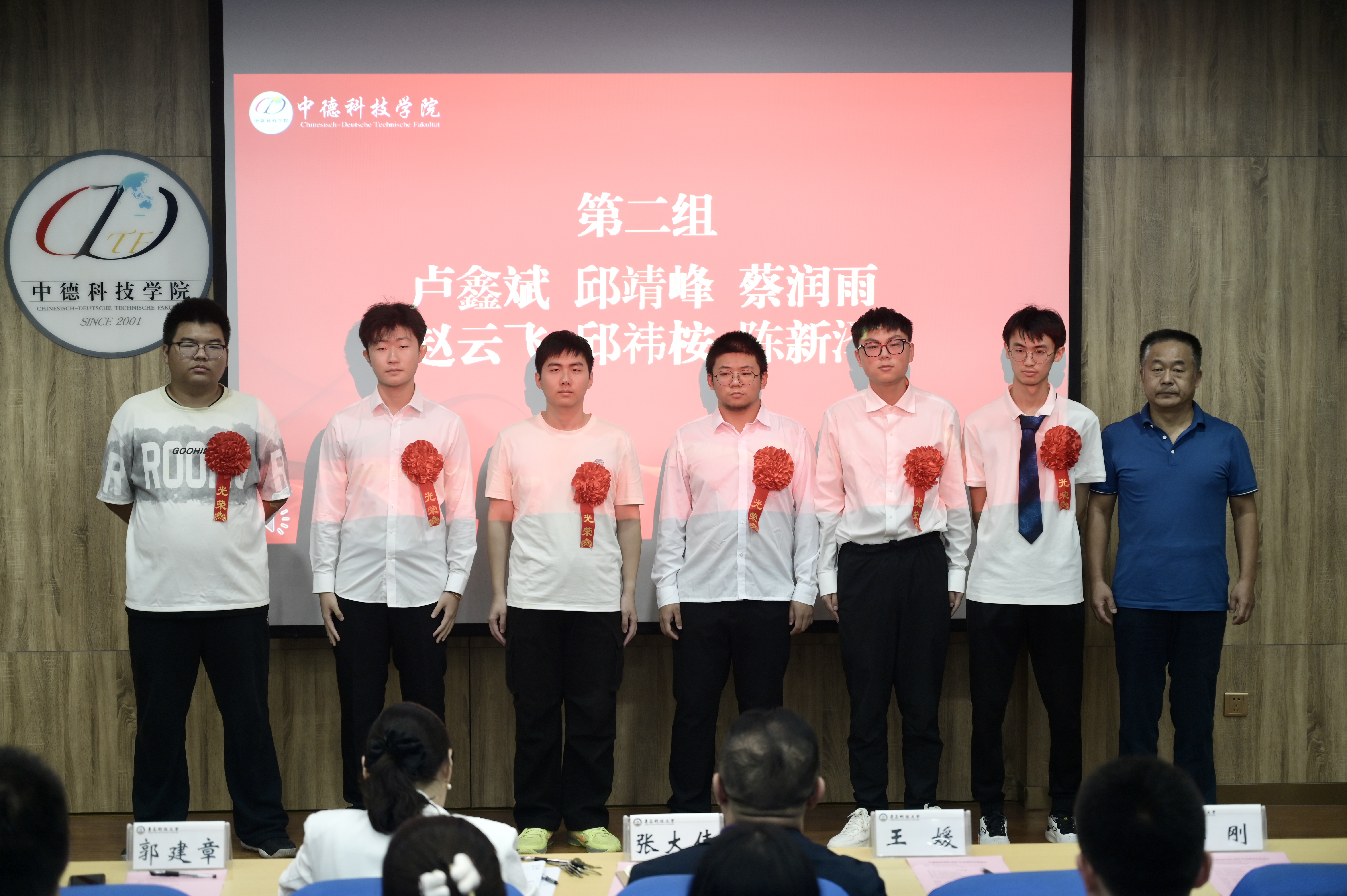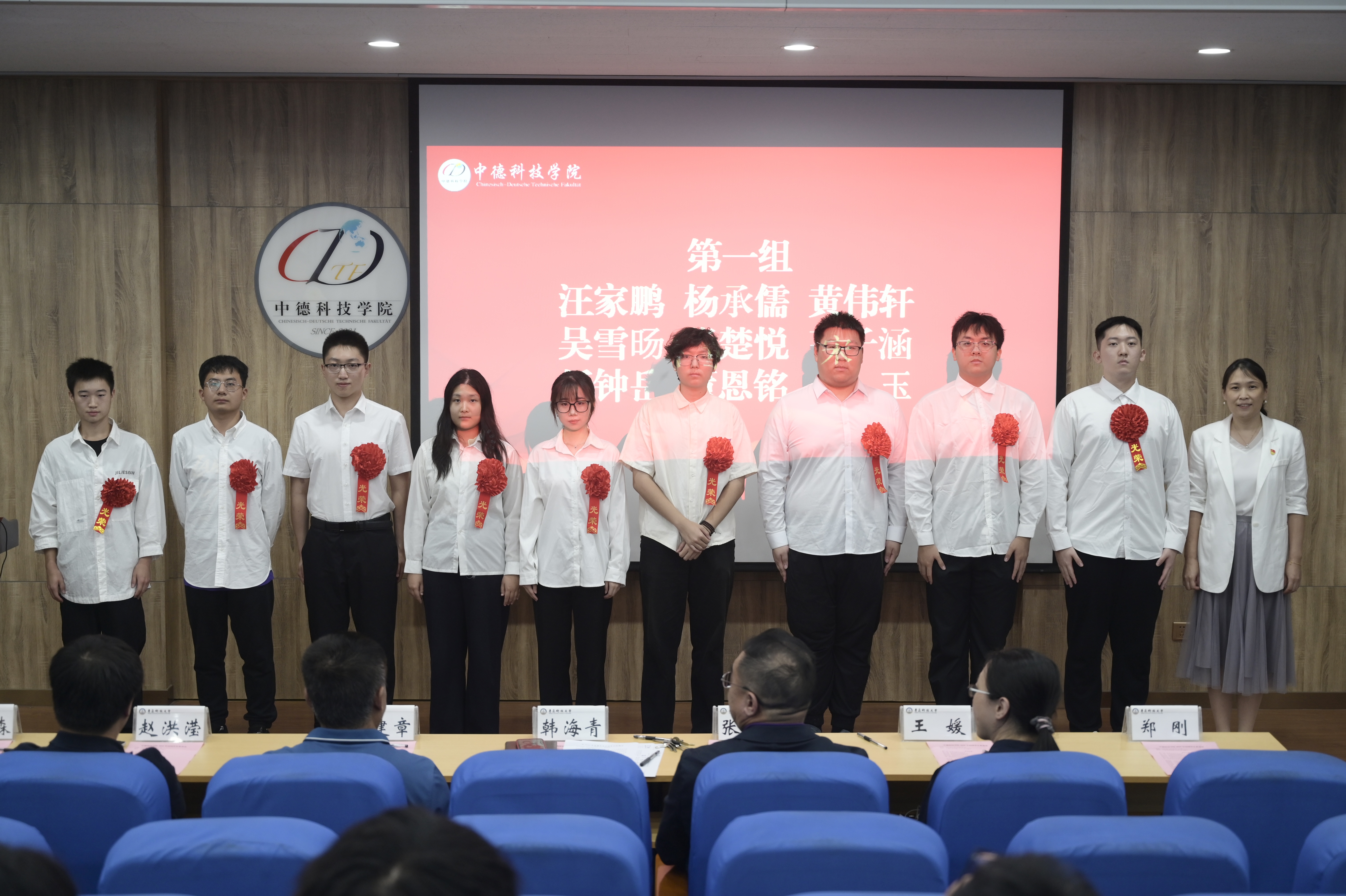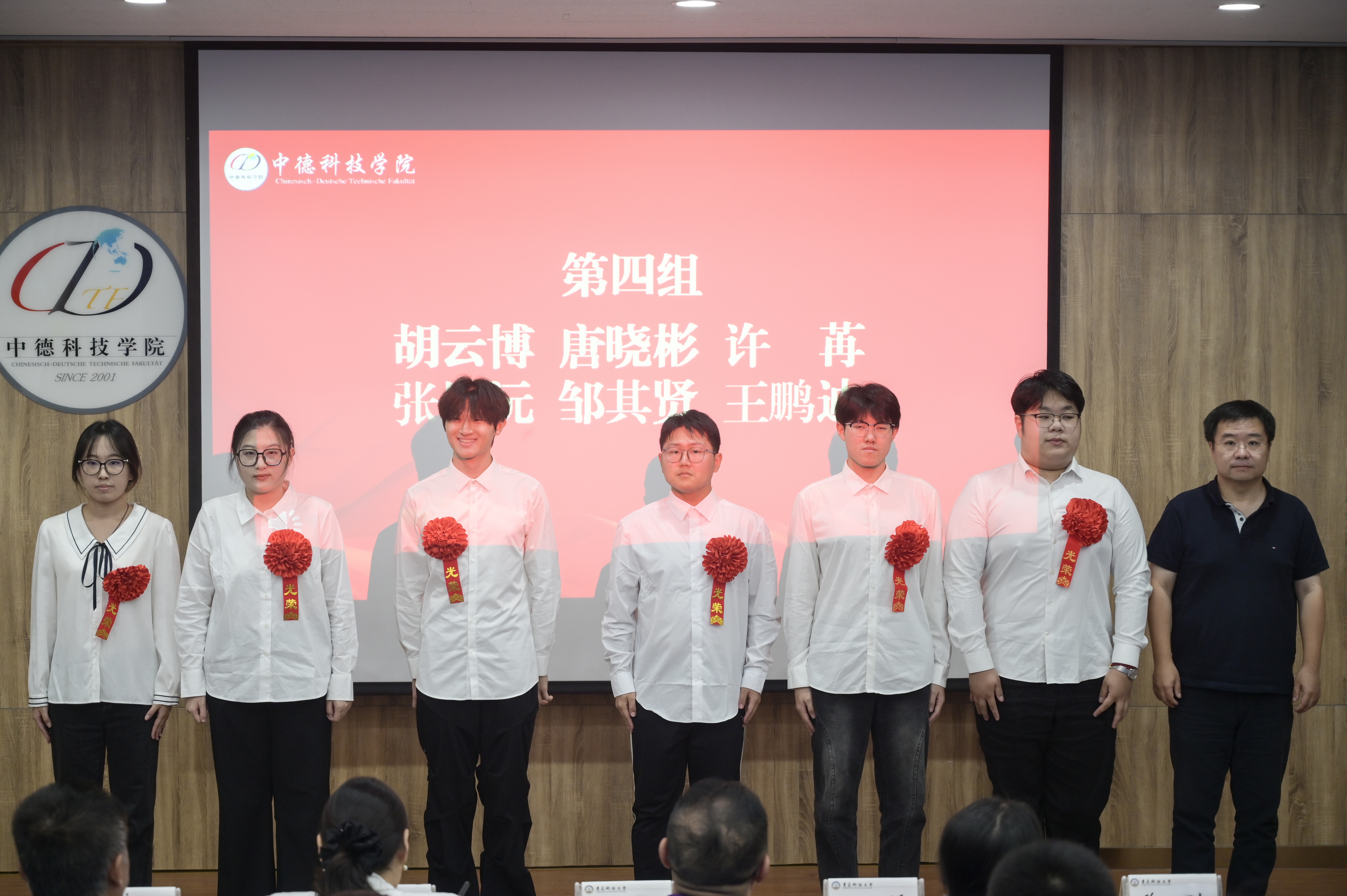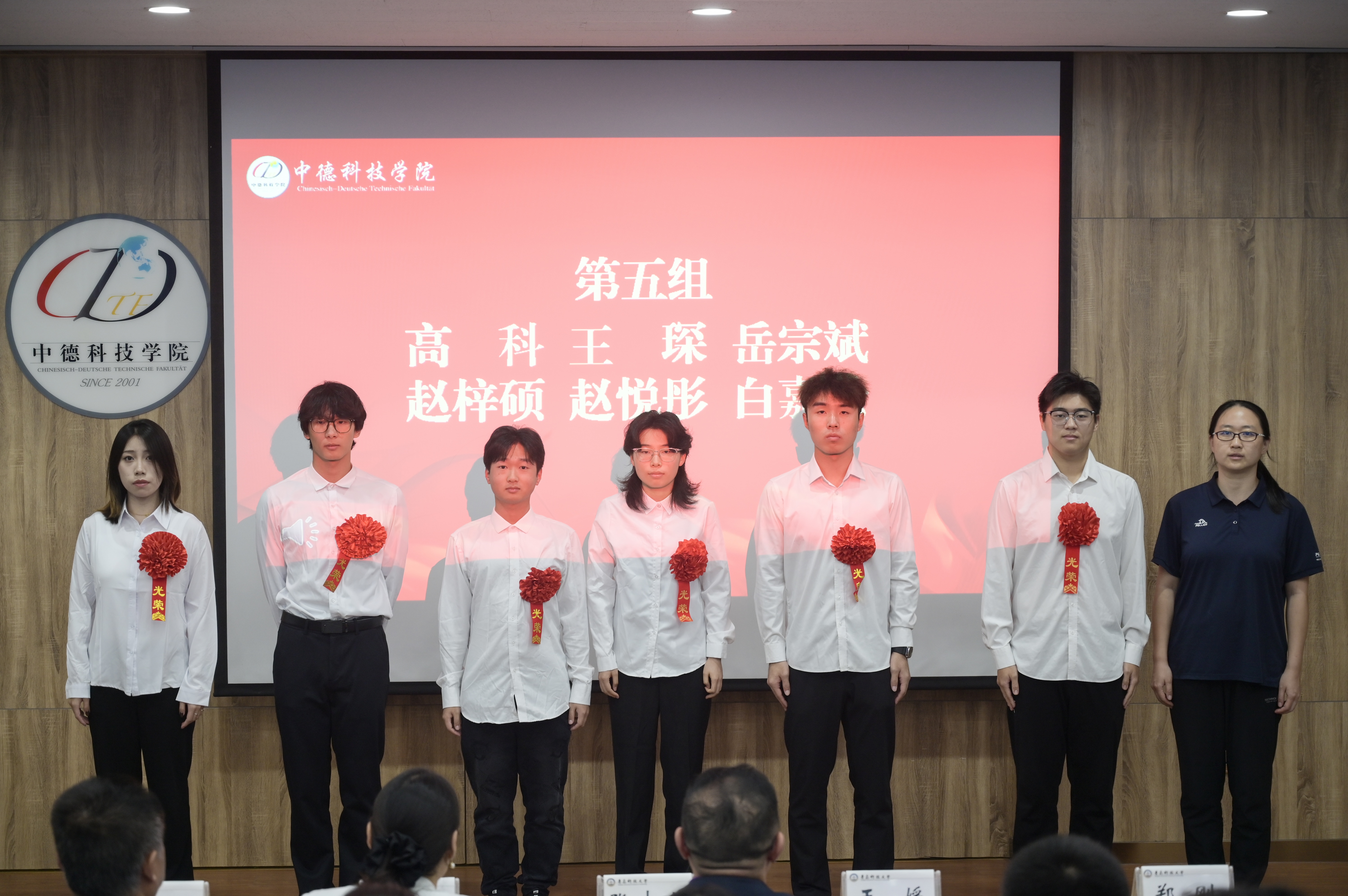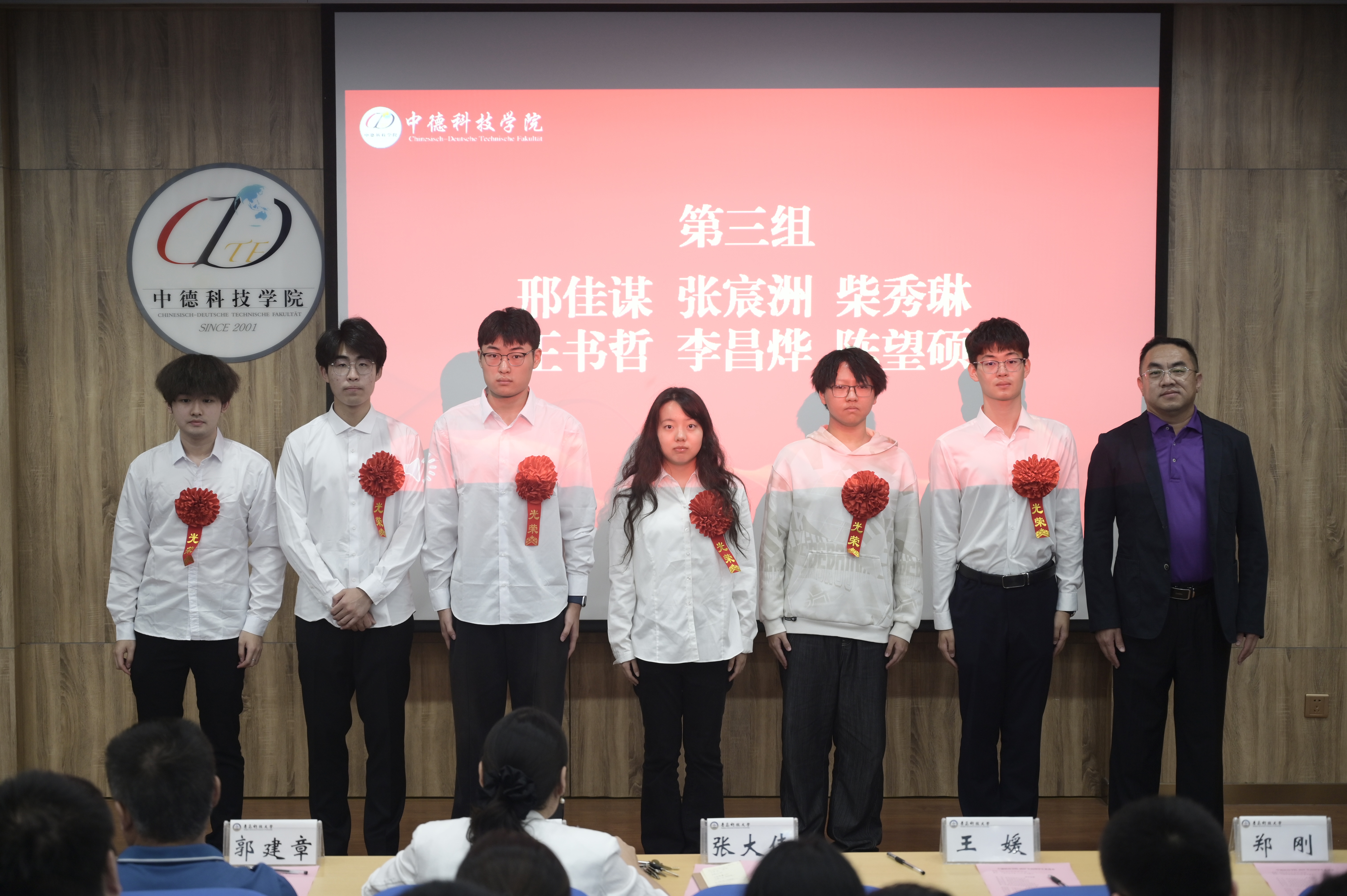 党委书记韩海青、副经理郭建章、党委副书记兼副经理张大伟、副经理赵洪滢、信息助理王媛为出国员工代表颁授了荣誉红花。