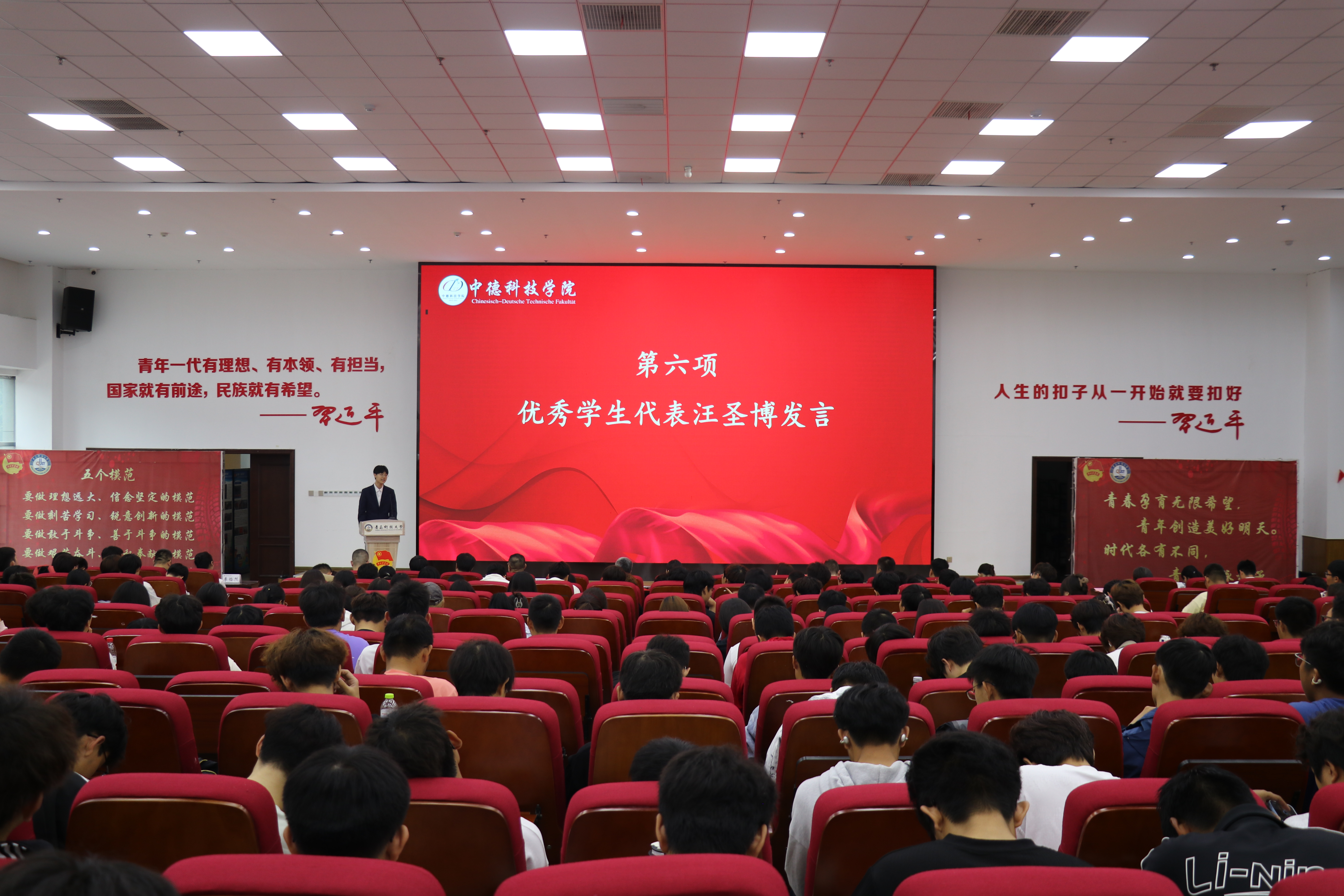 在校员工代表汪圣博与2025级新生代表董树贤分别分享了他们的学习心得与收获,引发了在场同学们的强烈共鸣和热烈反响。
