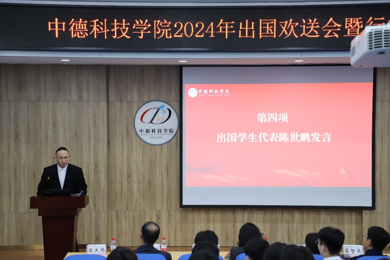 出国员工代表陈世鹏发言。他表示将珍惜出国留学机会,拓宽国际视野,争取早日学成归国,回报社会。