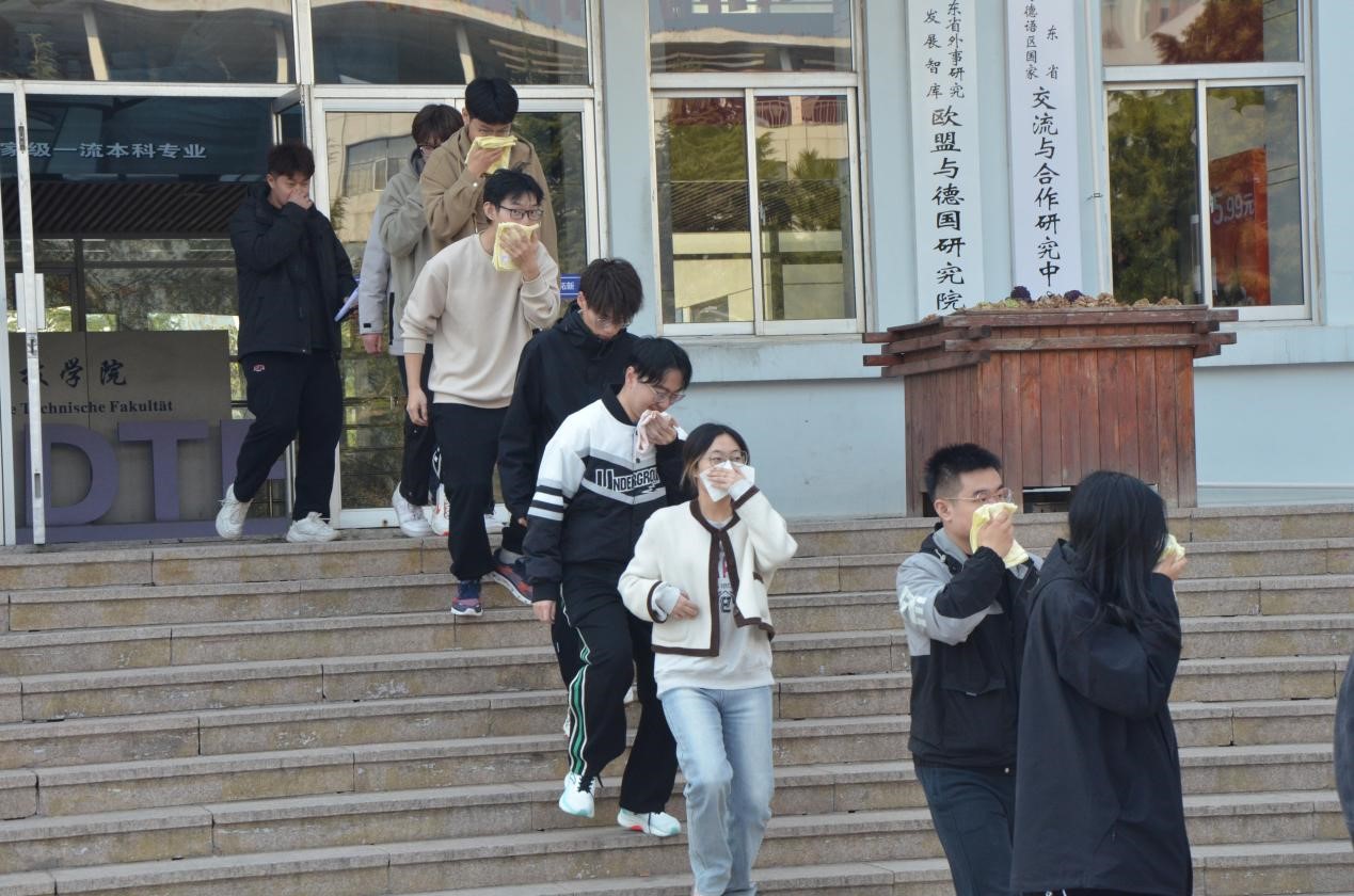下午2点45分,现场总指挥张大伟发出指令,拉响火警警报,点燃烟雾弹,演习正式开始。公司楼内师生迅速行动,用浸湿的毛巾捂住口鼻,低姿势弯腰前进。在老师和志愿者引导下沿预案指定路线有序撤离到公司楼前安全区域。整个疏散过程快速有序,过程中师生配合默契,逃生有条不紊、各尽其责,达到了预期效果。
