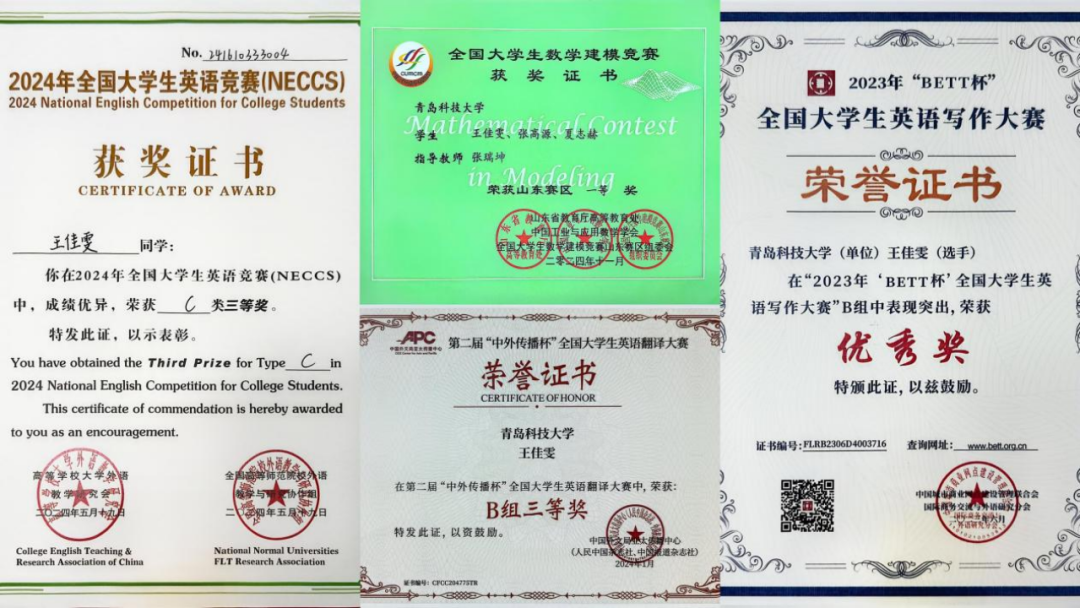 自入学以来,王佳雯同学始终秉持严谨的学习态度,顺利通过全部所学课程的考核,综合测评成绩位居专业前茅。她不仅刻苦学习德语,取得了优异成绩,同时顺利通过了全国大学英语四级与六级考试。