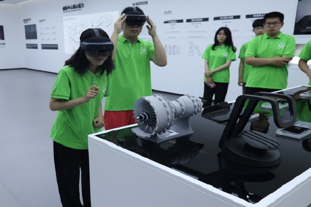 实践团队参观了虚拟现实制造业创新中心展厅,通过讲解,他们了解到VR产业未来的发展趋势、产业生态以及在AR领域的主要产品与技术,现场体验VR技术在各个领域的应用。同学们戴起VR眼镜,在VR+制造专区观看并拆解了正在工作的发动机模型;在VR+医学专区,同学们通过两只机械笔真实感受了口腔手术的力反馈系统,体验到了做口腔医生的感觉;在VR+文娱专区,同学们沉浸式的体验了VR电影的魅力。
