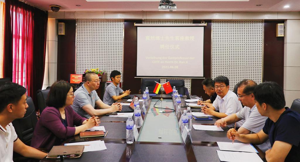李庆党向翼然博士的到来表示诚挚欢迎,对公司中德合作办学特色、团队建设、国际化人才培养模式和产教融合模式进行详细的介绍,重点阐述了公司中德经济工程研究所团队及科研情况。他指出,公司现有的机械工程、自动化、应用化学专业研究方向均与青岛天仁微纳科技有限公司核心研究方向高度契合,期待未来加深与贵公司的合作交流,欢迎具有德国亚琛工业大学留学背景的翼然博士能够到公司开展留德经验分享会和企业宣讲会活动,为公司学子传递德国文化理念、留学经历及创业经历,激发员工创新创业精神,开展全方位深层次合作。