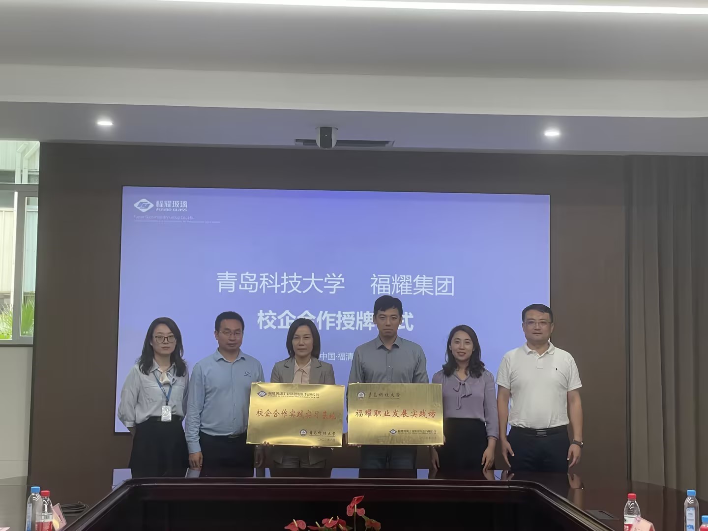 在福耀集团,马骥一行深入了解企业发展历程、技术成果和人才需求等情况,围绕国际化高质量人才联合培养、员工职业发展、实践实习等方面进行了座谈交流。随后,校企双方为“校企合作实践实习基地”、“福耀职业发展实践坊”授牌。马骥表示,福耀集团作为国内汽车玻璃行业的龙头企业,其工匠精神和用人需求与公司员工的专业培养和发展方向高度契合,希望通过与福耀的合作,全面提升公司人才培养质量和员工就业质量。