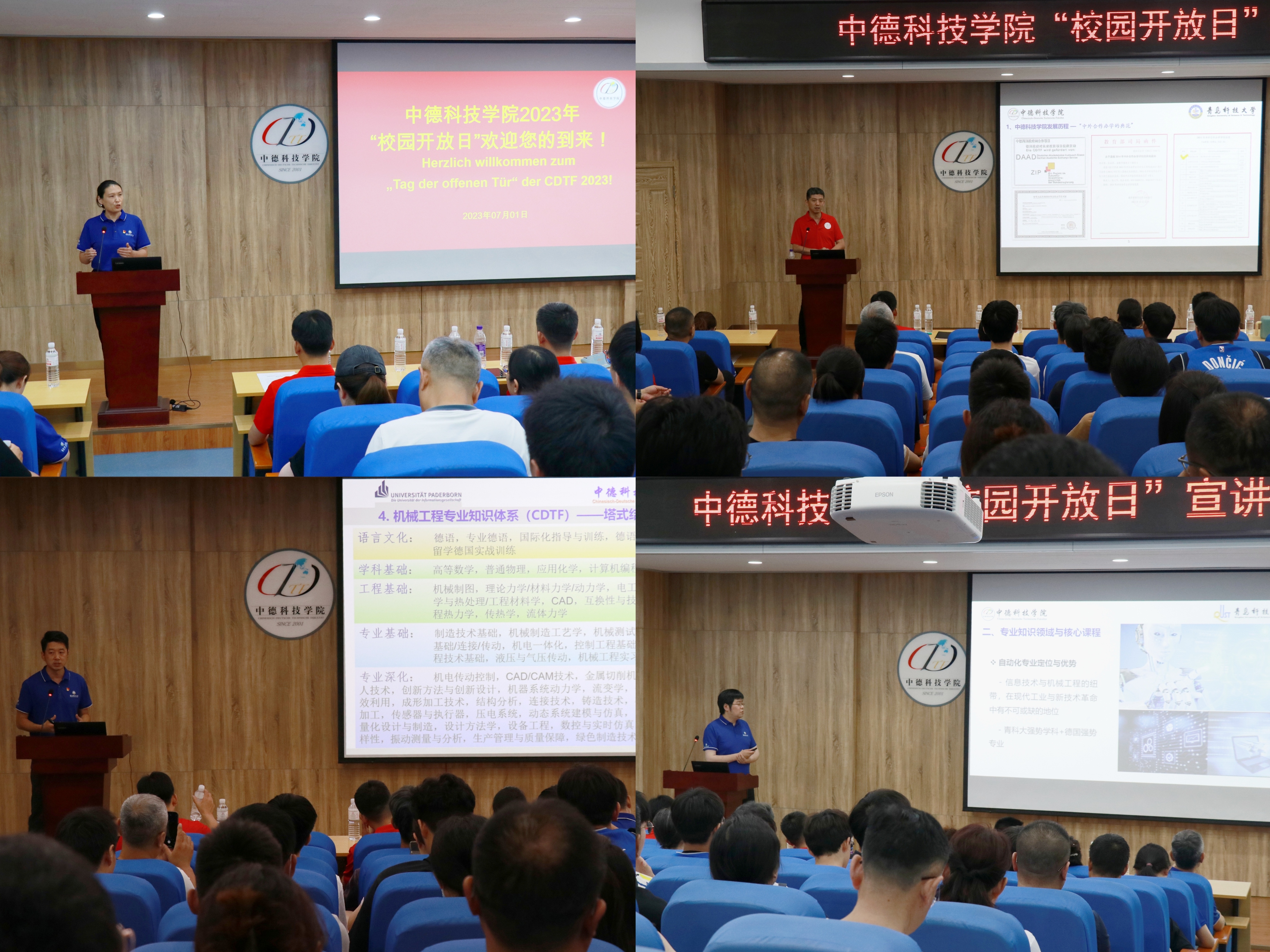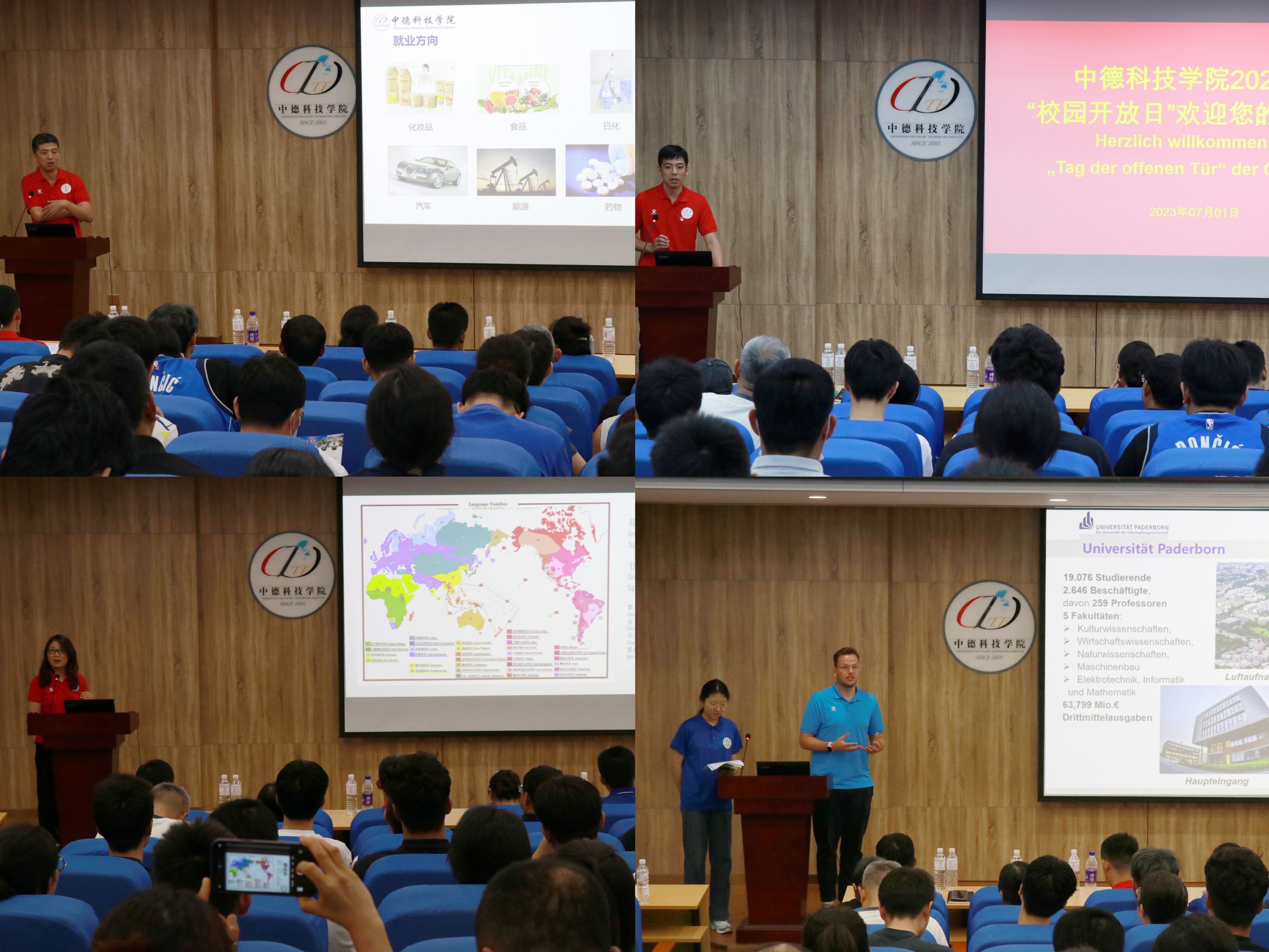机械工程教研室主任曲之超、自动化教研室主任柴文楠、应用化学教研室负责人杨子江老师分别从人才培养目标、德国学科专业、德方合作院校、专业知识体系、员工就业前景及德国校园印象等方面做了专业介绍;德语教研中心副主任赵乾老师从德语团队、德语学习、德语分级教学、德语口语角、中德下午茶等方面让考生及家长充分感受德语的语言魅力;“在华机械工程”硕士项目职工代表丹尼尔博士从项目背景、专业知识学习、助教工作、德国大公司园生活等方面向考生及家长生动展示了公司合作大学帕德博恩大学的相关情况。