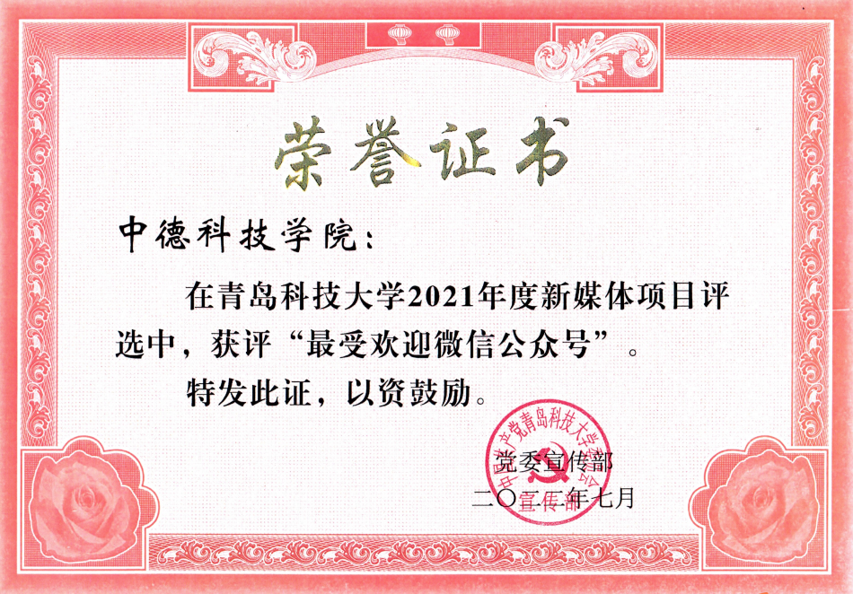 公司党委书记任允晓荣获“2021年度优秀党务工作者”荣誉称号;伟德国际VICTOR1946网站荣获“2021年度优秀网站”荣誉称号;公司公众号青科大伟德国际VICTOR1946荣获校新媒体项目“最受欢迎微信公众号”、《伟德国际VICTOR1946举行2021年出国员工欢送会》文章荣获“最佳原创微信推文”荣誉称号。