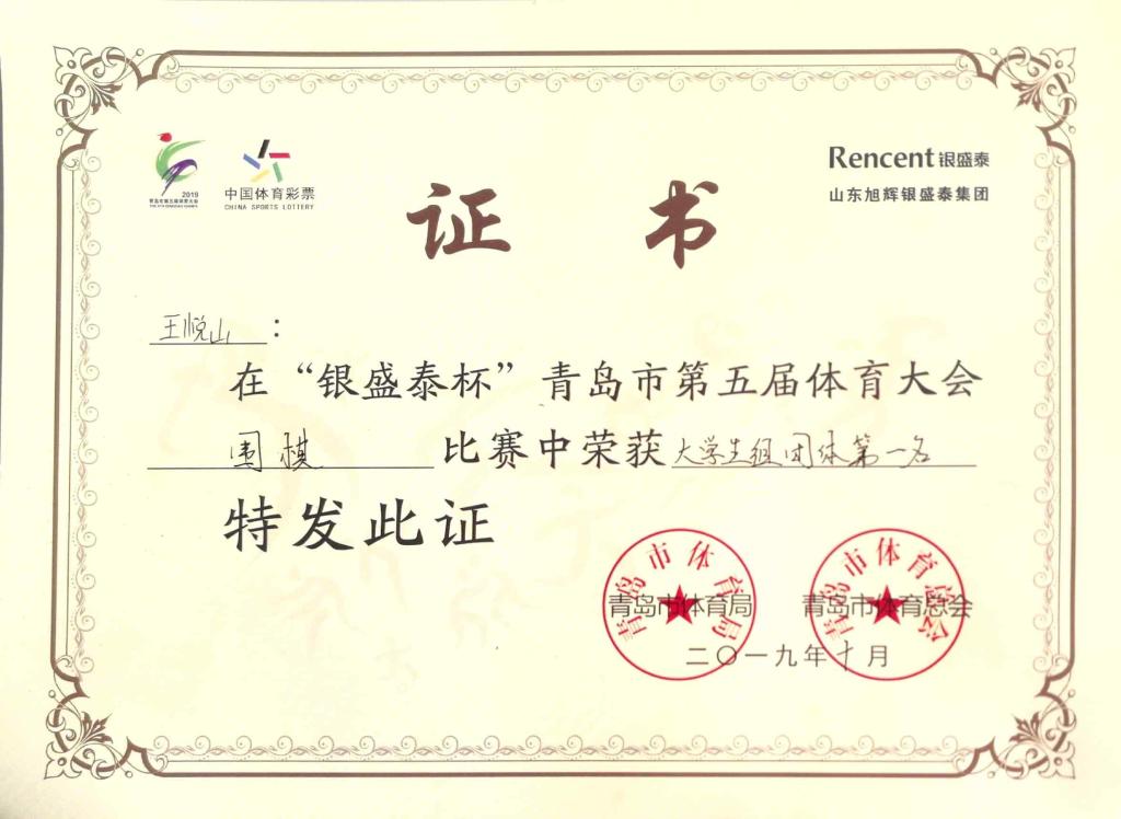 近日,伟德国际VICTOR19462019级机械工程专业王悦山在青岛市第五届体育大会围棋比赛中,获老员工组团体第一名、老员工男子个人组第三名。
