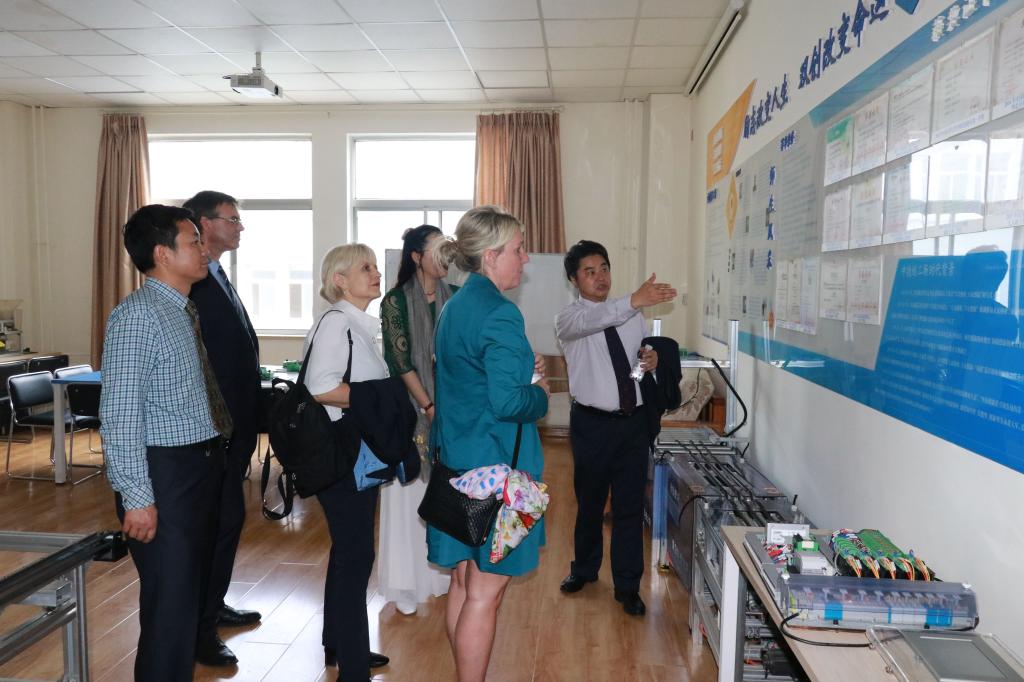 揭牌仪式后,德国北威州教研部科研局局长威兰特和迈尔副董事长一行参观了公司“语言培训与考试中心”办公场地以及院德语教学教室、创客空间——中德创工场,详细了解了员工德语学习和科技创新开展情况。