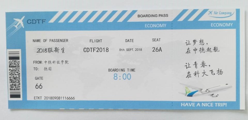 伟德国际VICTOR1946为每一位新生准备了一份特别的礼物——德国直飞“机票”,希望2018级的同学们能够搭乘梦想的中德特航,成为社会认可的高水平国际人才。机票背面留有公司在新生报到前建立的中德新生QQ群、家长QQ群、微信公众号,公司依托这一信息平台及时推送最新消息,帮助新生尽快地融入到中德这个大家庭中。