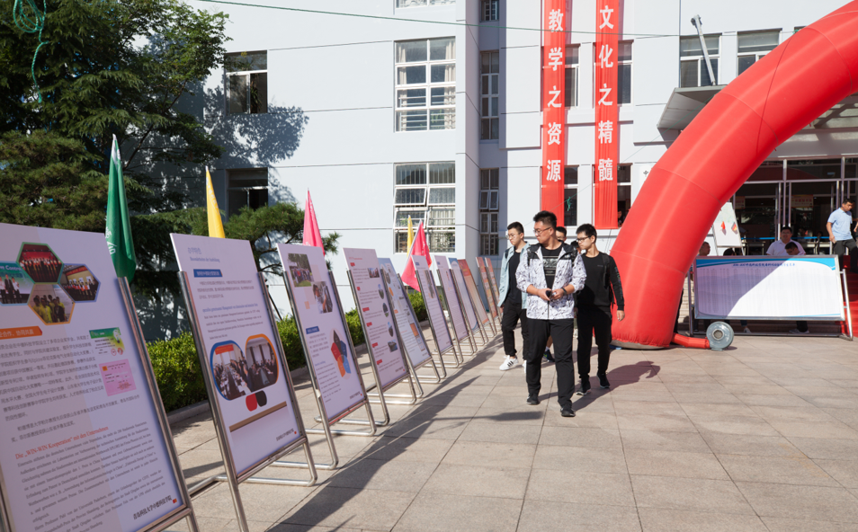 在中德楼门外两侧竖有多块“中德榜样”展板,展板内容是历届中德优秀学子的介绍,其中不乏获得经理奖学金、学业优秀奖学金的优异事迹。这体现中德公司深厚文化底蕴,激励新生以其为榜样,向梦想迈进。