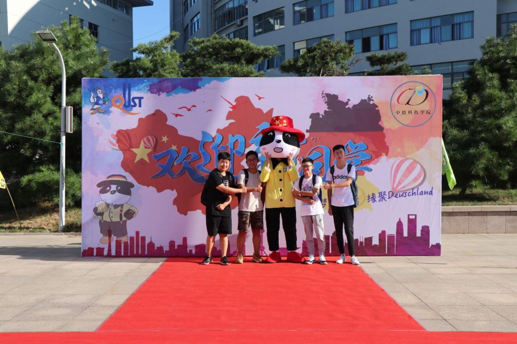 在完成新生手续注册后,18级新同学在志愿者的引导下走过楼前红地毯,与中德吉祥物大福合影。大福面带微笑,张开双臂欢迎每一位怀揣梦想的新生,员工会新闻中心特别安排了固定照片的拍摄,为新生留下了入学以来的第一张笑脸照。