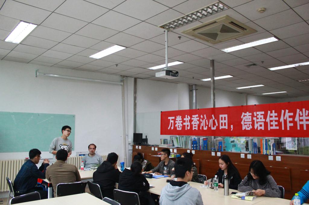 机械中德161的季本浩向大家推荐了一本德语书籍(Tatsachen Ueber Deutschland)中文名叫德国概况,该书介绍了德国的政治、经济、文化、生活等,能够让大家对德国有一个基本全面的概括认识,他从书本的内容整体构架出发给大家讲解了这本图书的大体内容,并选取了部分段落供大家赏析。同时德国外教Danniel以图书为基础向大家拓展了一下关于德国的相关概况,还向大家另外推荐了两本更加适合员工的德语书籍,此外外教和大家积极的讨论与交流,进一步让大家对德国有了更全面的了解。