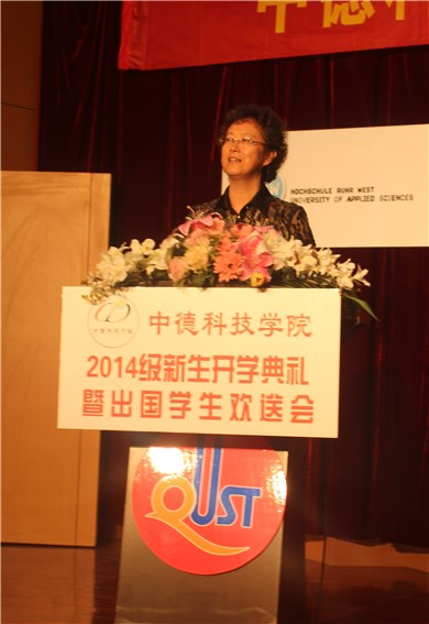 会上,副董事长张淑华发表了热情洋溢的讲话,希望中德公司面向现代化、面向世界、面向未来,以高屋建瓴的战略视野,密切双方教师合作,不断优化人才培养方案,使中德公司人才培养质量再上新台阶。对2014级新生和即将出国员工提出了希望和要求,希望同学们在今后生活、学习中发扬中华传统优秀精神,努力做到志存高远、善于拼搏、敢为人先、坚忍不拔、自强不息、团结协作、顾全大局、爱国爱家爱父母爱班级,真正成为展示中华民族风采的优秀学子;赴德国留学的本科同学、研究生同学和来华留学的研究生同学要积极主动的适应当地的生活,严格遵守德国和中国的法律法规,充分尊重两国的历史文化传统,不做有悖道德伦理的行为,正真成为两国友谊的建设者和文明的传播者;希望同学们始终保持青年人的朝气和志气,在困难和挫折面前永不服输、永不言败,同时要用世界眼光看问题,做事情,要不断增强自身的综合素质,实现自身的全面发展。并送给新生“辛勤成就梦想,汗水浇筑成功”,“业精于勤荒于嬉,行成于思毁于随”两句话,希望同学们能够迎难而上,不折不挠,实现全面成才。