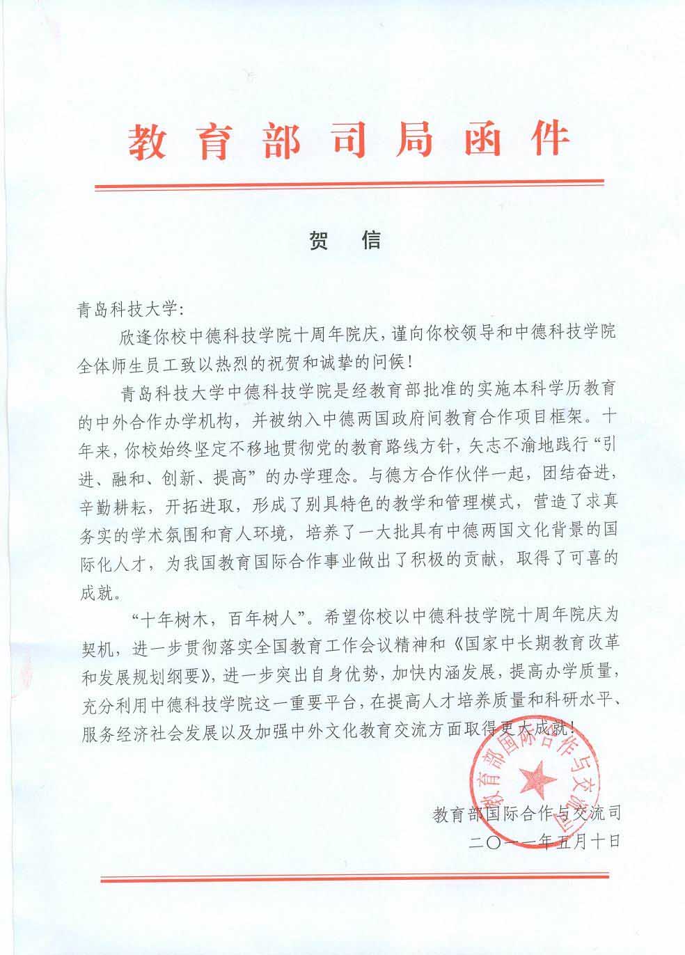 【中德公司十周年院庆】教育部国际合作与交流司为伟德国际VICTOR1946十周年院庆发来贺信