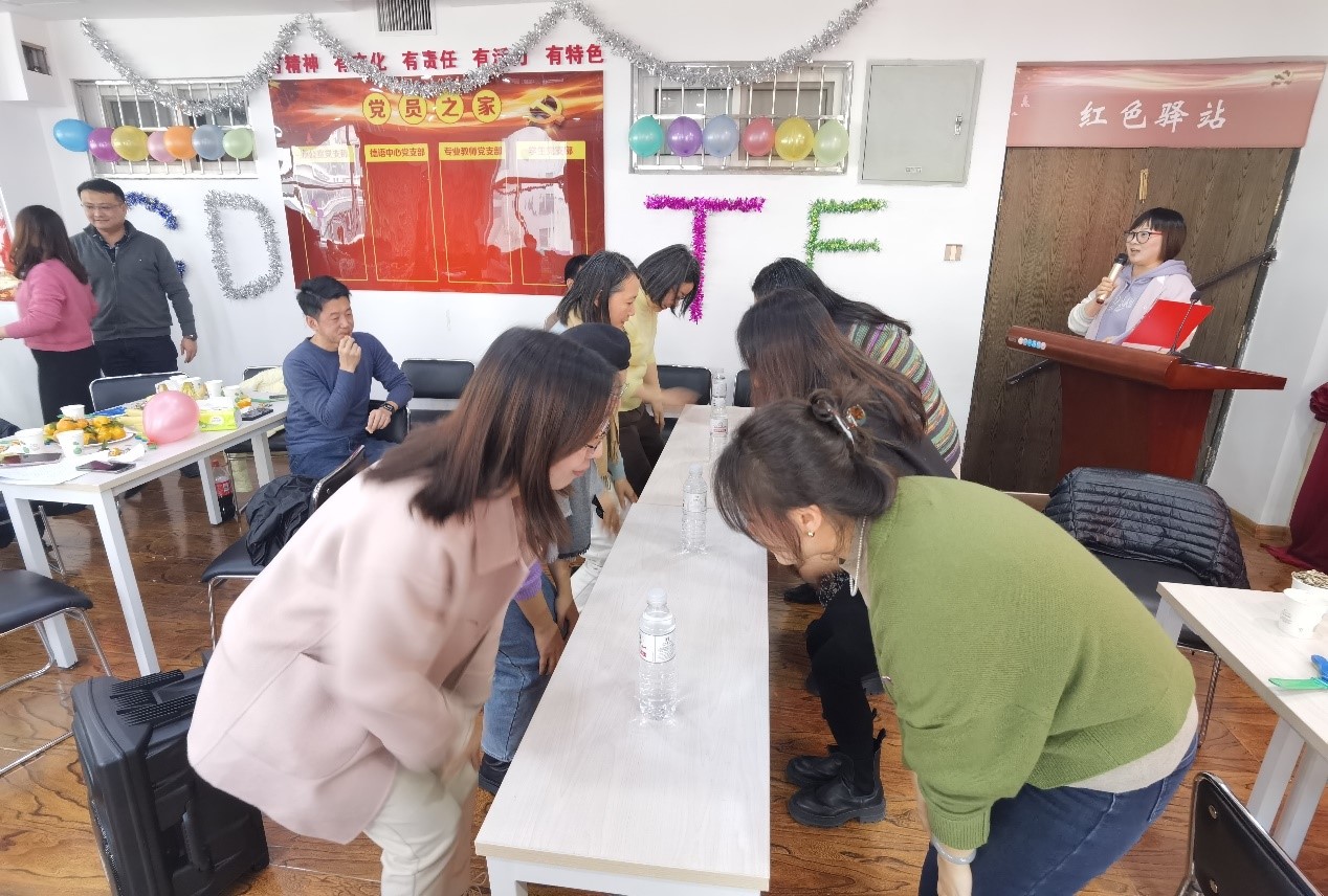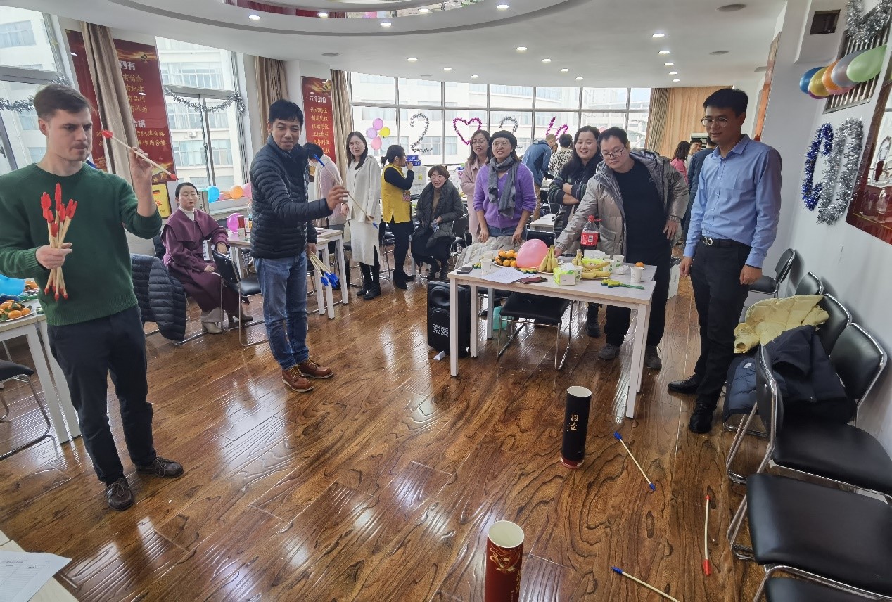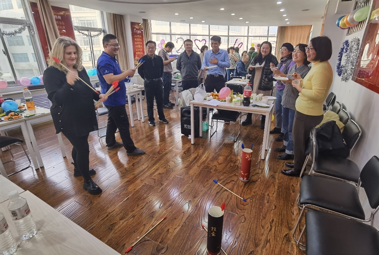 节目表演结束后,正式进入了“快乐运动展风貌,凝心聚力促发展”趣味运动会环节。此次趣味运动会进行了“面对面抢水瓶”和“趣味投壶”两个游戏。在游戏环节中,中德双方的教职工们精神饱满,活力十足,全力以赴,既彰显了个人风采,赛出了集体的凝聚力,又让德国教师感受到了投壶这项中华传统体育项目的魅力。游戏过程中,中德双方教职工们一起包饺子,相互切磋、交流包饺子技术,一边分享着一年来工作的喜悦和困惑,烘托出浓厚的节日氛围。