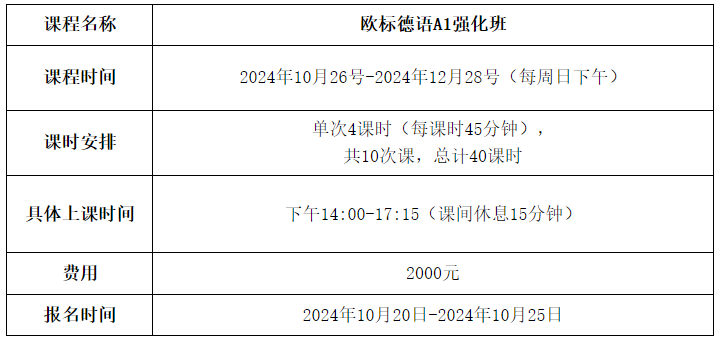 亲爱的同学,伟德国际VICTOR1946语言培训与考试中心计划于2024下半年开办欧标德语A1强化班,该课程为线下小班授课,班额15人左右。