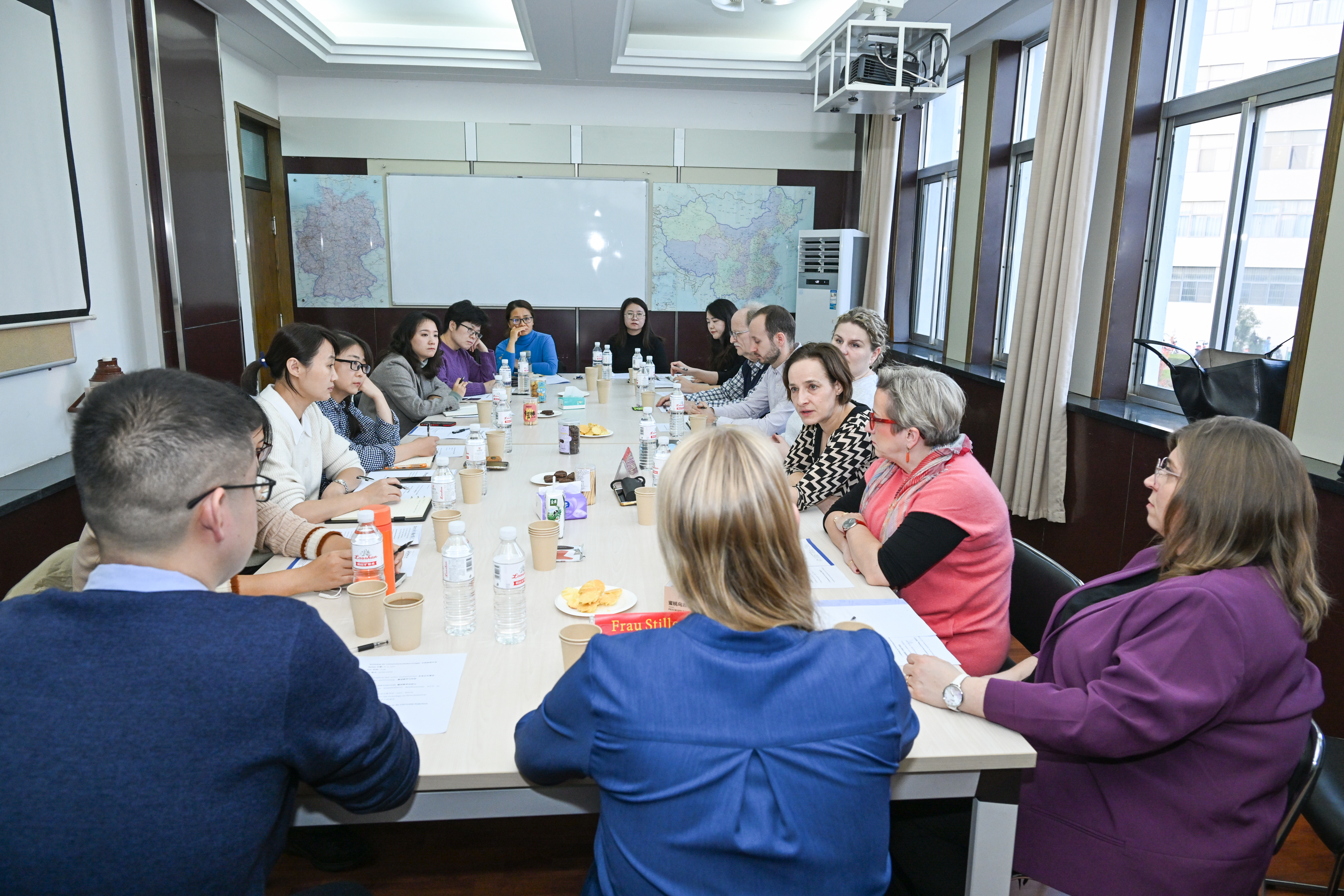 文科组在伟德国际VICTOR1946楼A4106召开会议,施蒂勒女士、泽恩教授、巴尔韦格教授、施利姆巴赫女士、伊索女士、弗兰克加德曼教授、阿诺加德曼先生,伟德国际VICTOR1946德语培训中心、中德工程公司德语教学中心相关负责人参加会议。中德双方探讨了沟通式语言教学法(CLT)及多媒体技术在德语课堂中的应用,提出了关于员工选拔录取、分班制度及标准、德语外教聘任等方面的系列建议。此外,双方还对ÖSD考试及德福考试进行了困难解析,研究探讨了其他同等类型考试的可能性。最后,还针对中方教师在德培训及双方科研合作进行了讨论。