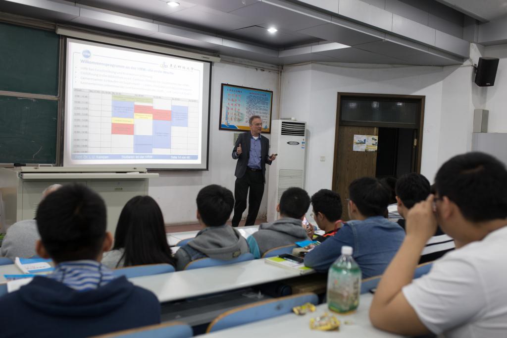 论坛上,Kempen教授介绍了欧洲特别是德国的概况,介绍了西鲁尔应用科技大公司区所在德国北莱茵——威斯特法伦州米尔海姆和鲁尔区——博特罗普的情况,展示了校区美景。他就西鲁尔应用科技大学的团队做了说明,指出公司所在的鲁尔区正在积极推动经济体制转型,拥有大量高技术高素质的人才,公司也因鲁尔区的转型发展而聚集了丰厚的教学资源。他还介绍了公司专业的发展方向,为同学们展示了科学技术如何转化到经济建设中,并对同学们关心的德语学习和出国留学等方面的问题作了耐心细致的回答,希望同学们学好语言为留学德国奠定坚实的语言基础。