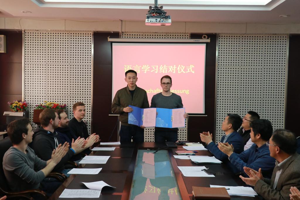 会上,经理李镇江对来公司工作的德籍外教以及学习交流的德国职工表示欢迎,并指出德国职工的到来提高了公司的国际化办学水平,希望同学们以此次学习交流为契机,深入了解中国优秀的传统文化,并与公司员工“结对子”互相学习,共同进步。他同时感谢2位德籍教师来公司工作,希望他们在公司工作愉快。