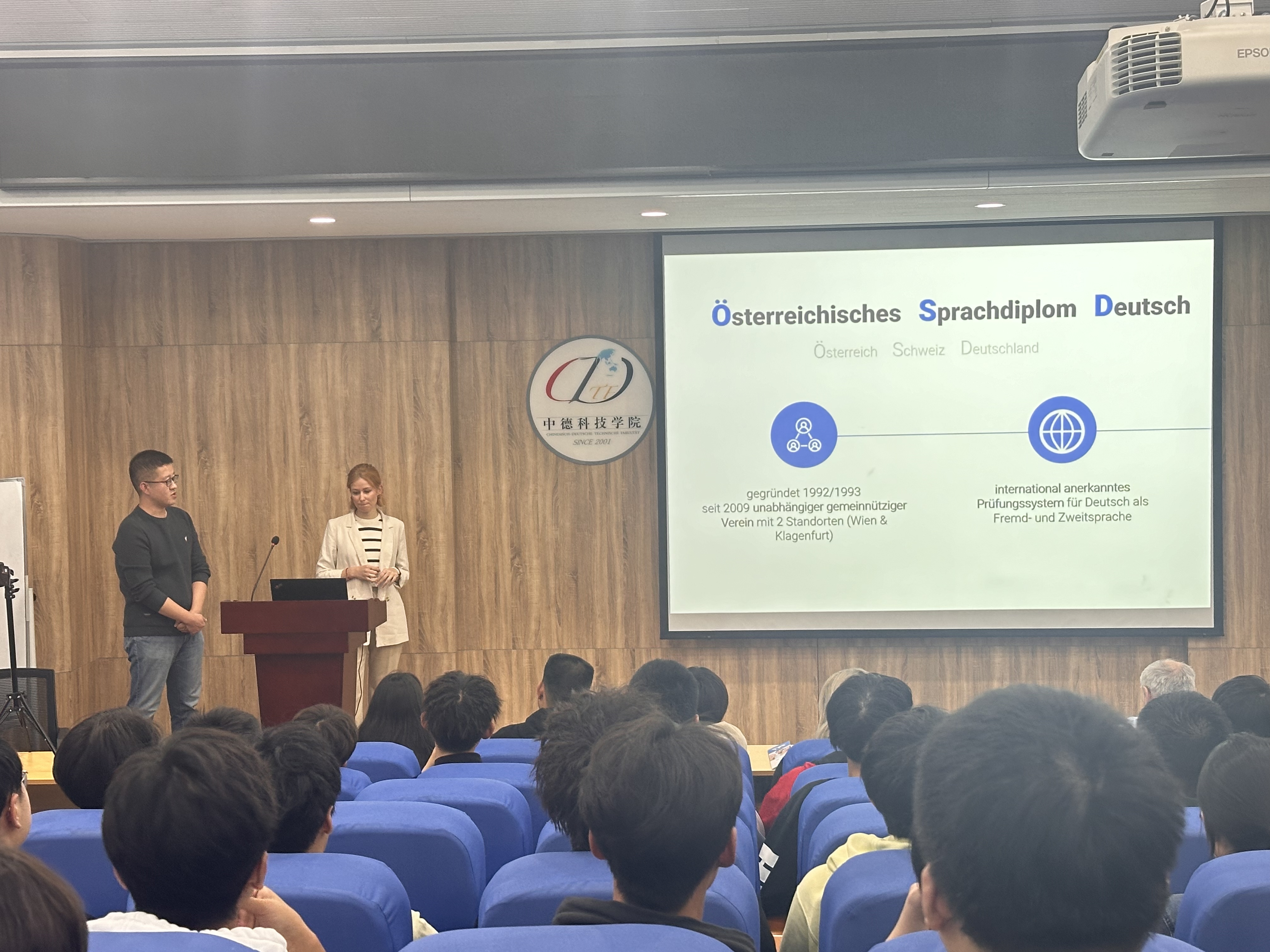 随后Karolina KRNJIĆ女士为22级员工进行了关于奥地利德语语言证书考试的讲座,介绍了奥地利德语语言证书考试中心的大致情况以及证书考试的历史、规模、举办形式以及未来发展等基本情况,并回答了同学们关于考试以及德语学习的若干问题。
